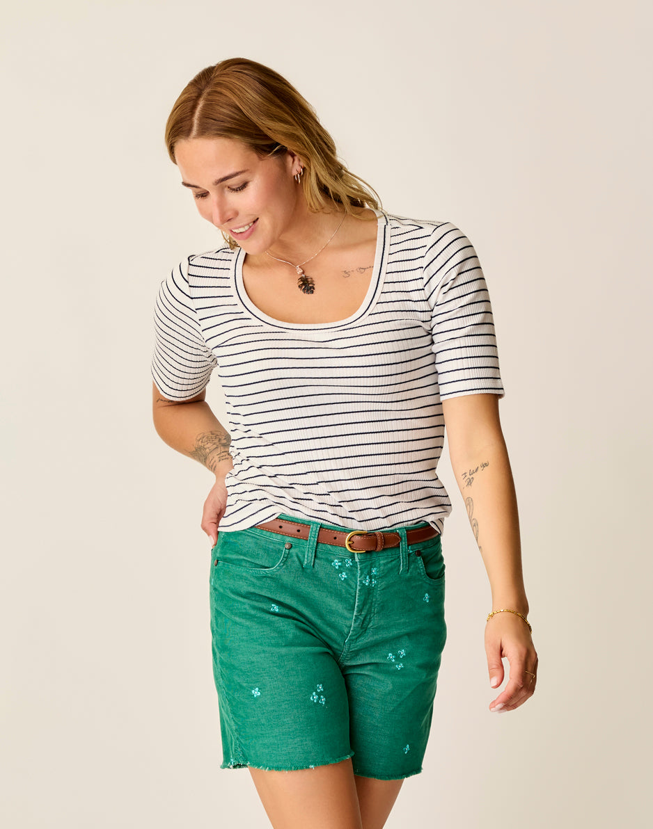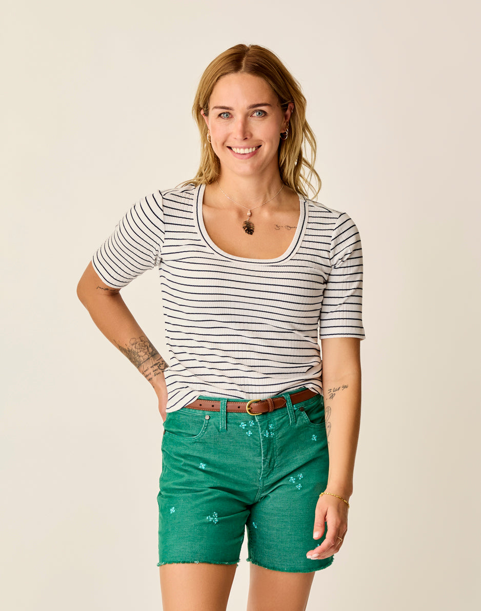 The Asher Rib Top is a simple pleasure that aims to please. Her half sleeve and perfect weight make the perfect layering piece. Which is perfect.
