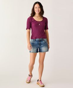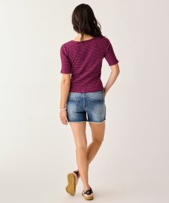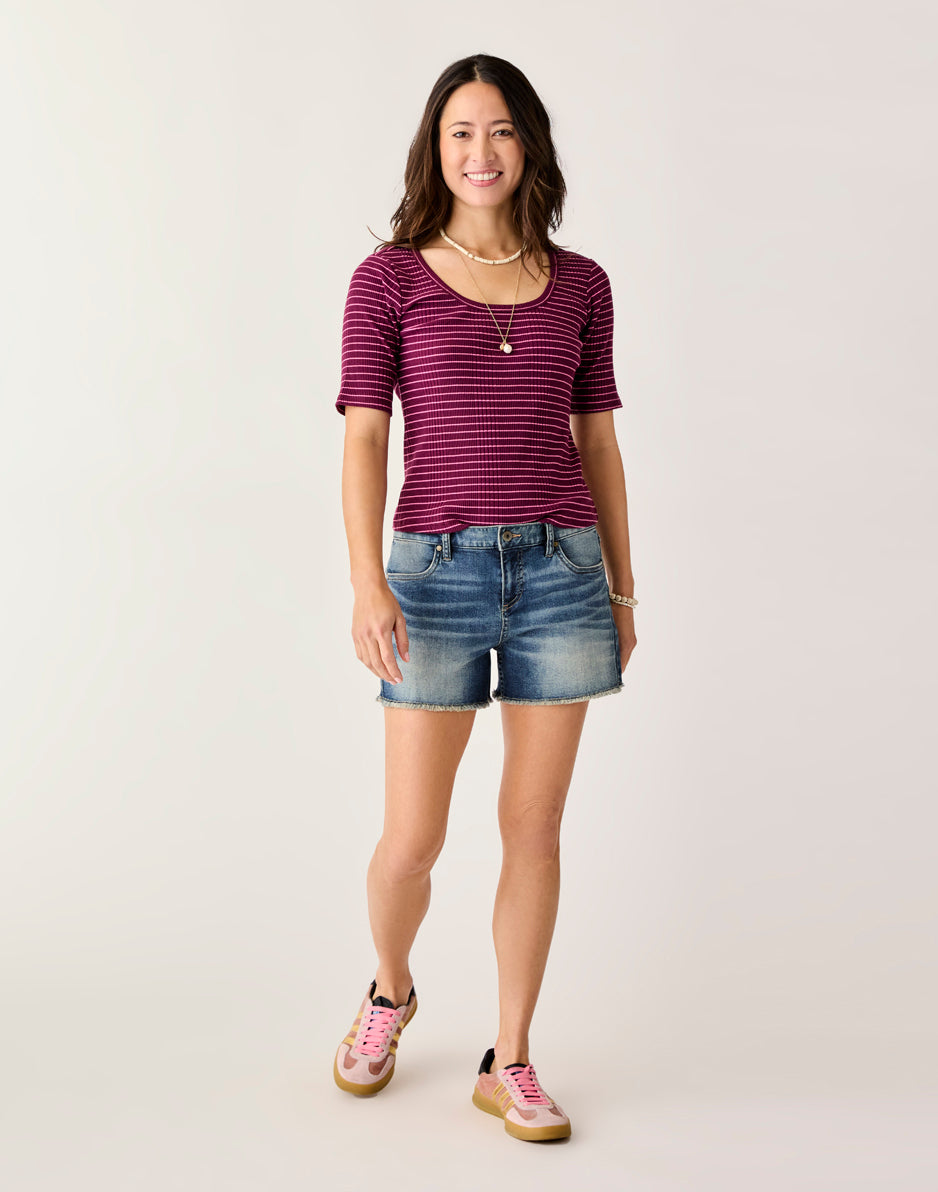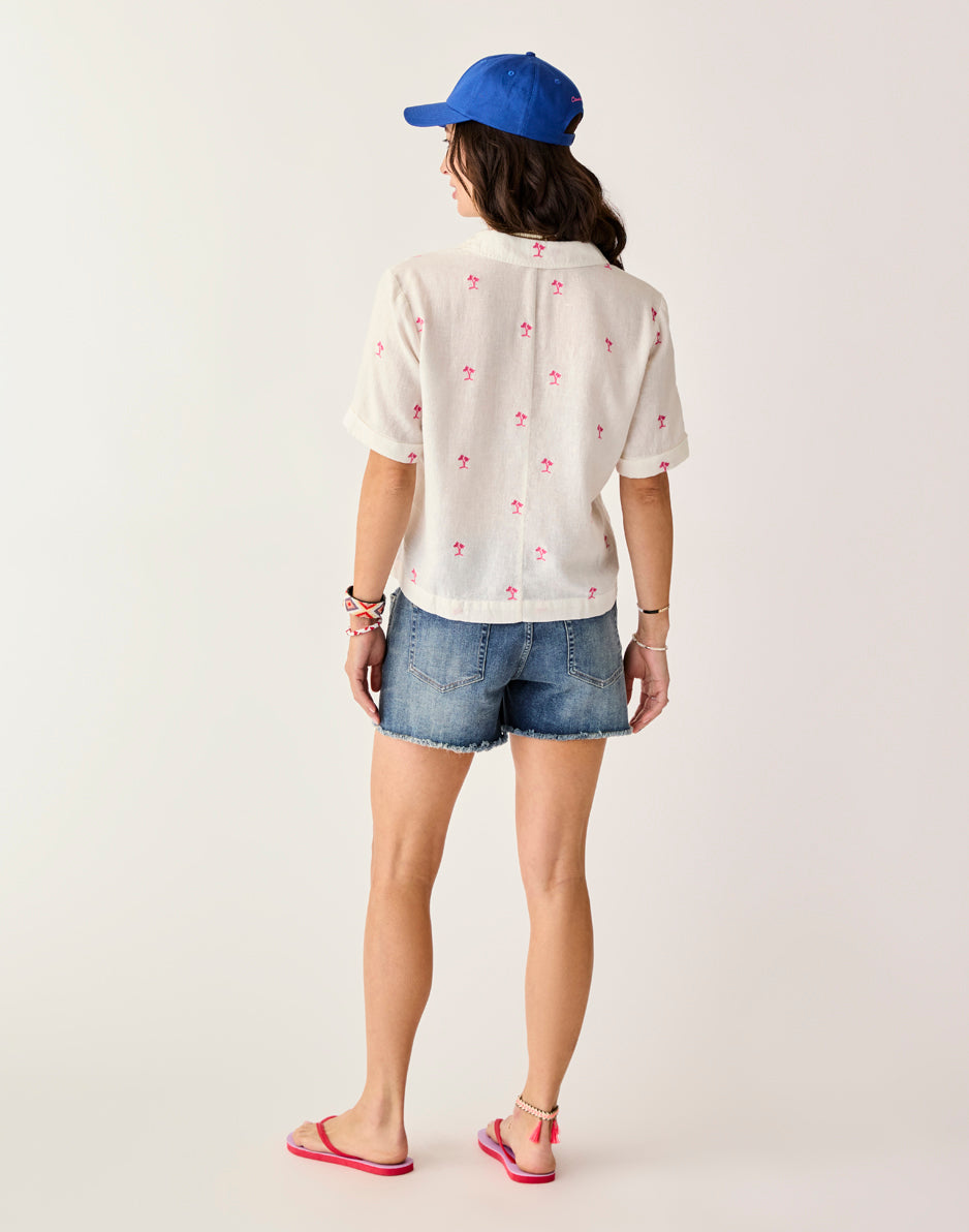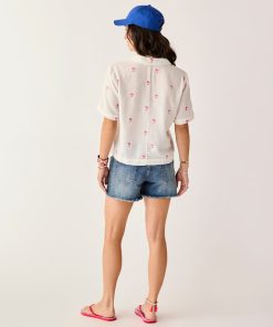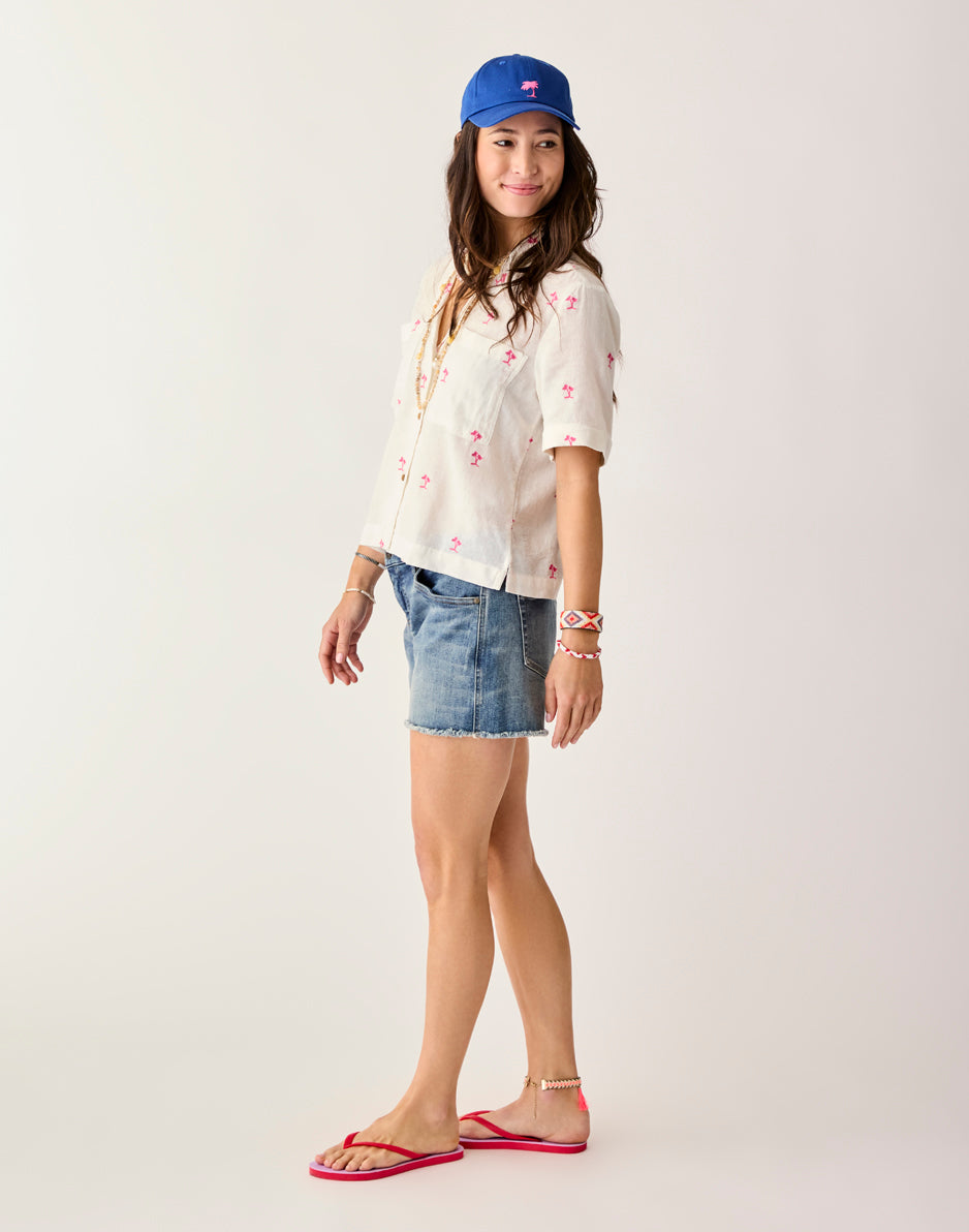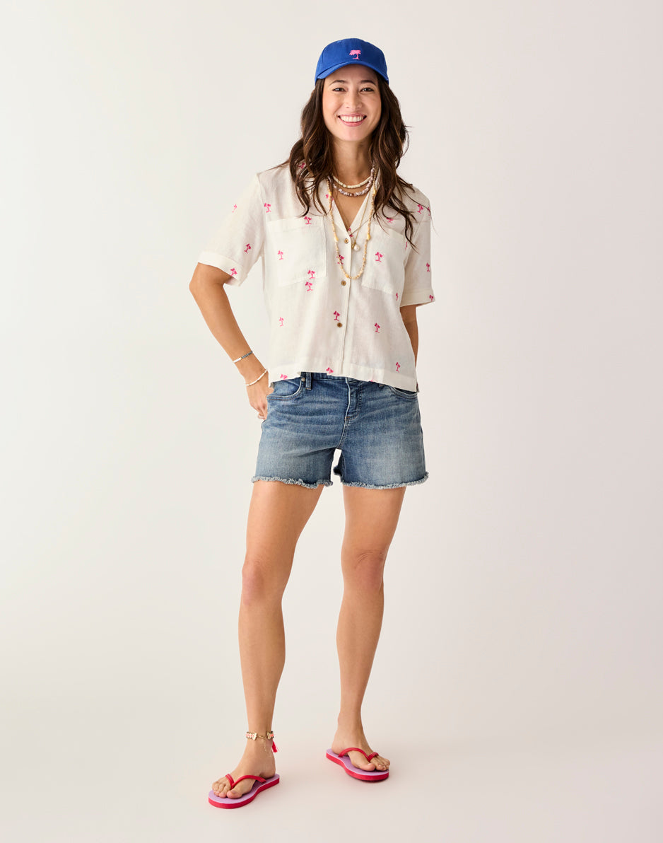 These stretchy denim shorts have the signature cut-off fringe hem, but also have extra styling in the beach-inspired embroidery. Your go-to cut-offs just got a makeover.