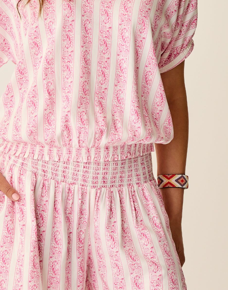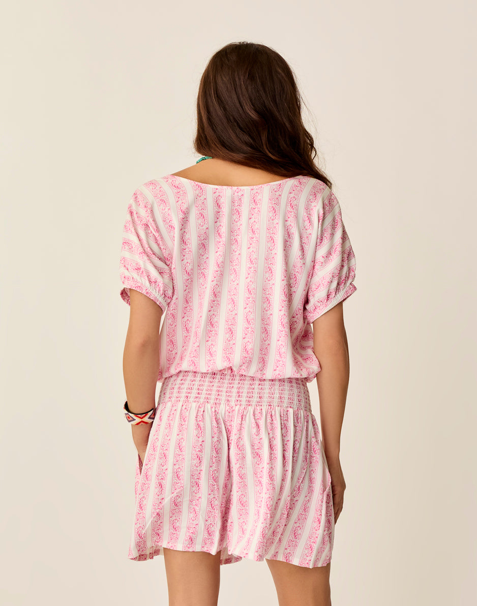 The sun just seems to shine a little brighter in the Celeste. Maybe it’s her scoop neck and Dolman sleeve with elastic sleeve opening? Or perhaps it’s her CF keyhole with button and smocked bottom hem? She’s a sum greater than her parts, so get your shades shined up.