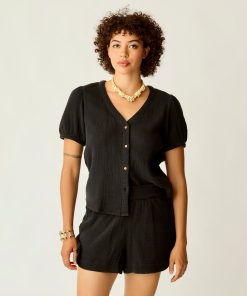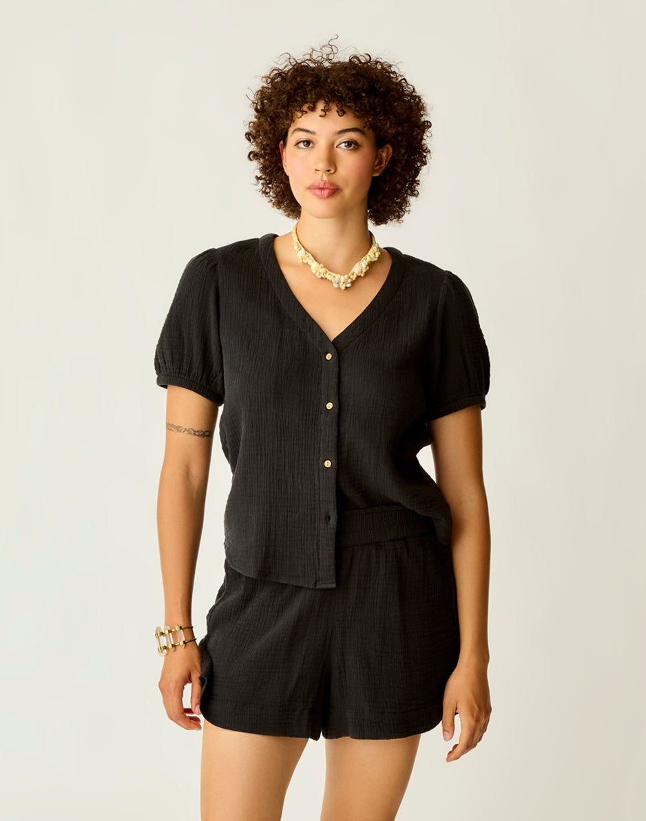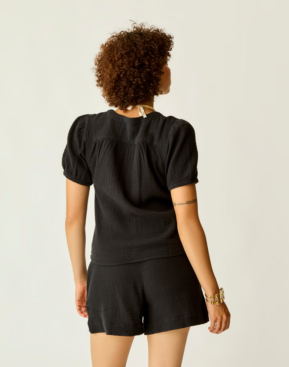 A warm weather winner, the 100% organic cotton Milo Gauze Top is an easy button up, with pleat detail on sleeve and elastic sleeve opening. Let it shine.