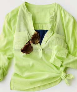 Simple sophistication make this lightweight summer top a weekend bag must. Chest pockets and three button open V-neck dial in the vibe in stride.