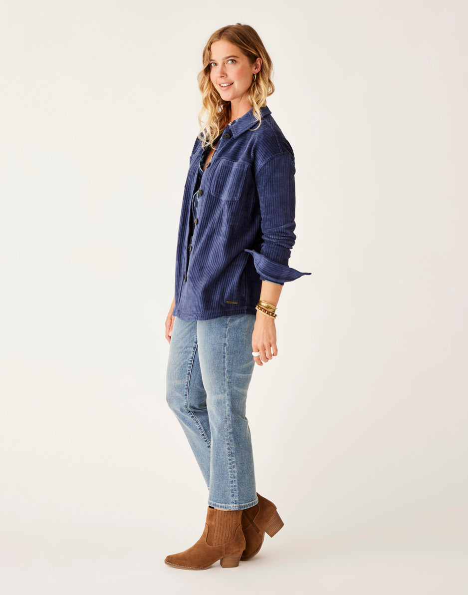 Choose your own adventure with this stretch cord shacket, sporting a shirttail hem, chest and side seam pockets as well as a button front closure. This is not our classic corduroy, but instead a slightly heavier weight, more lustrous and stretchy corduroy fabric that makes for the perfect layer.