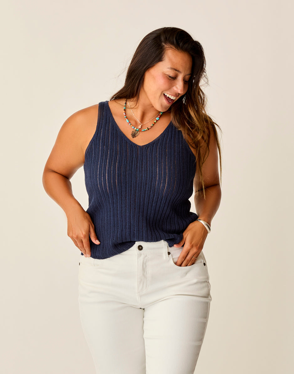 Soft and sexy, this easygoing 100% organic cotton sweater tank takes you away to that special place. A new and improved open knit stitch makes the top you know and love even more breezy, lightweight, and that much cuter for the summer months.